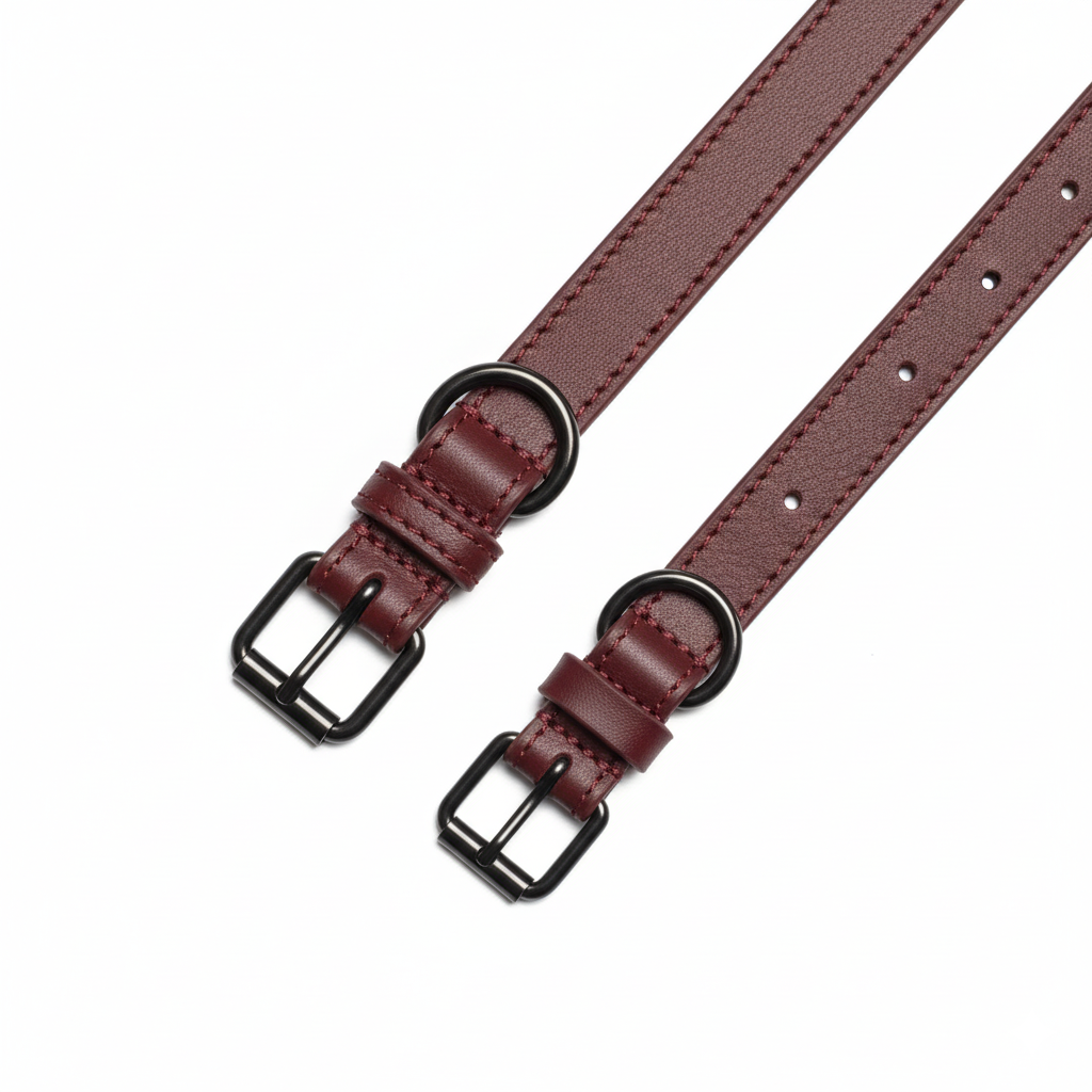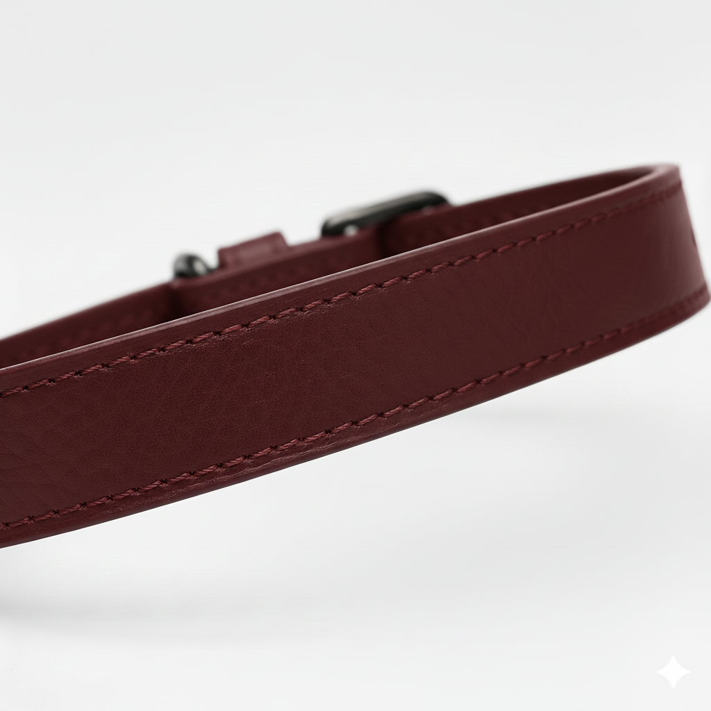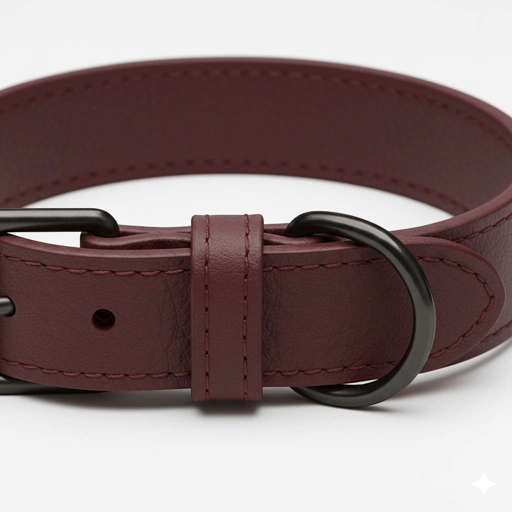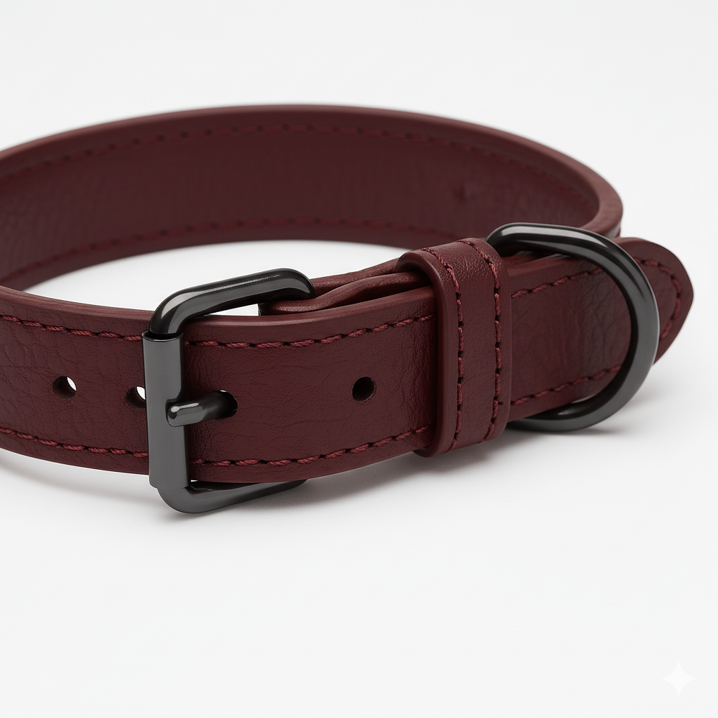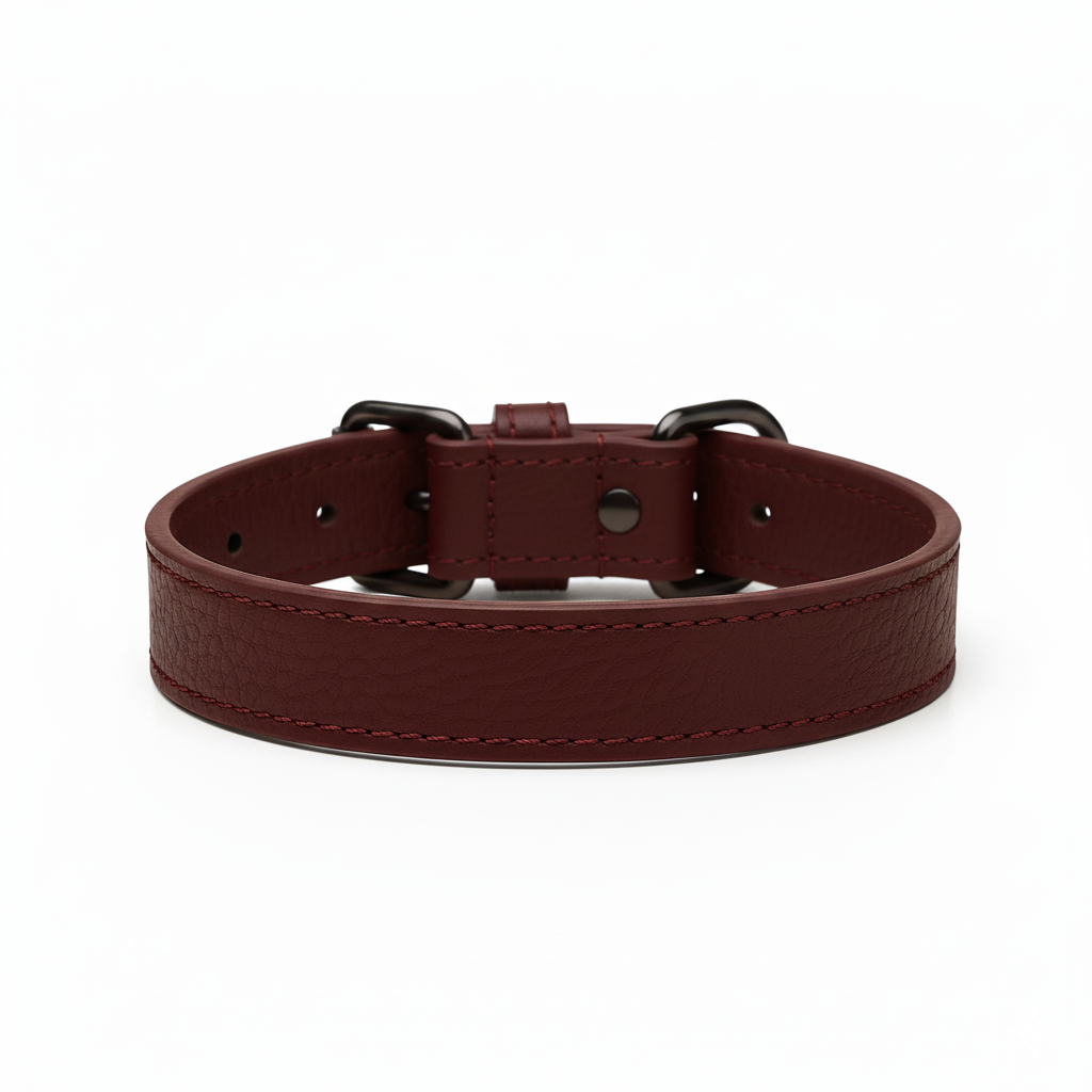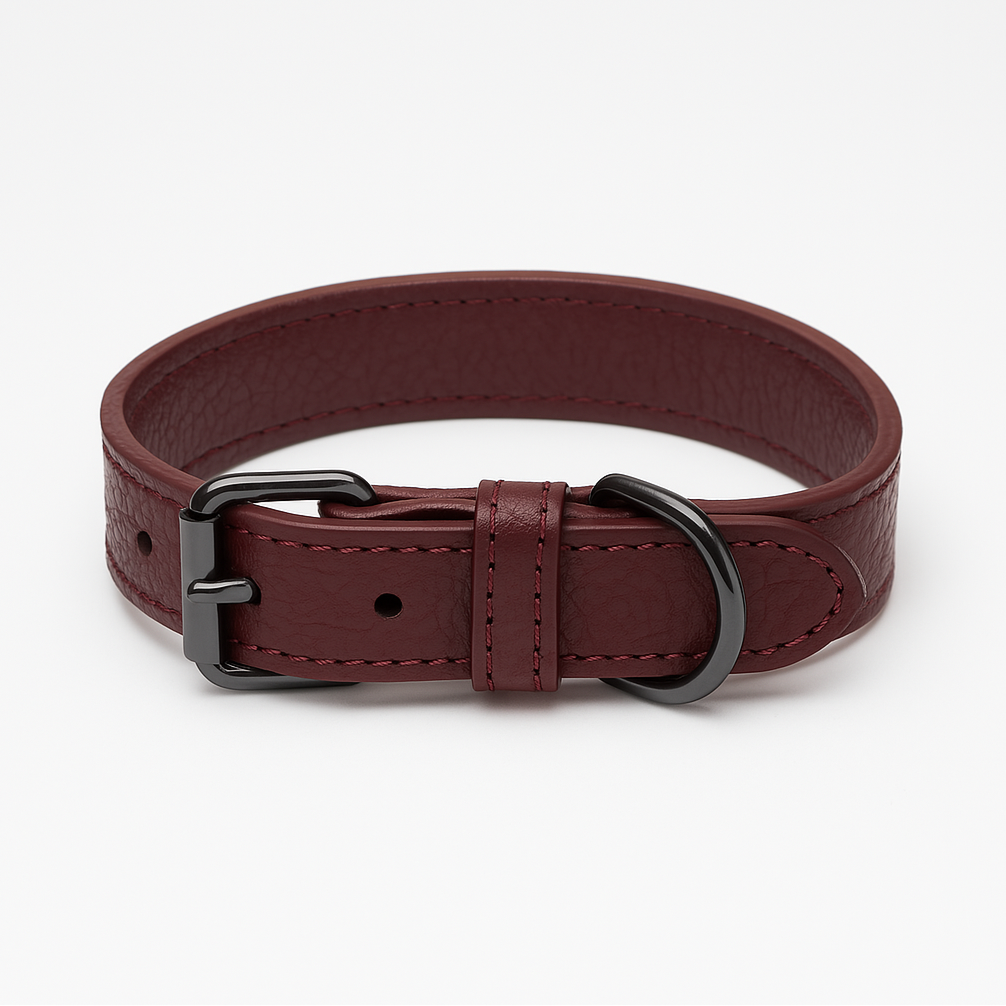 Collar para perro en un elegante tono burgundy, confeccionado en cuero italiano de tacto excepcionalmente suave.